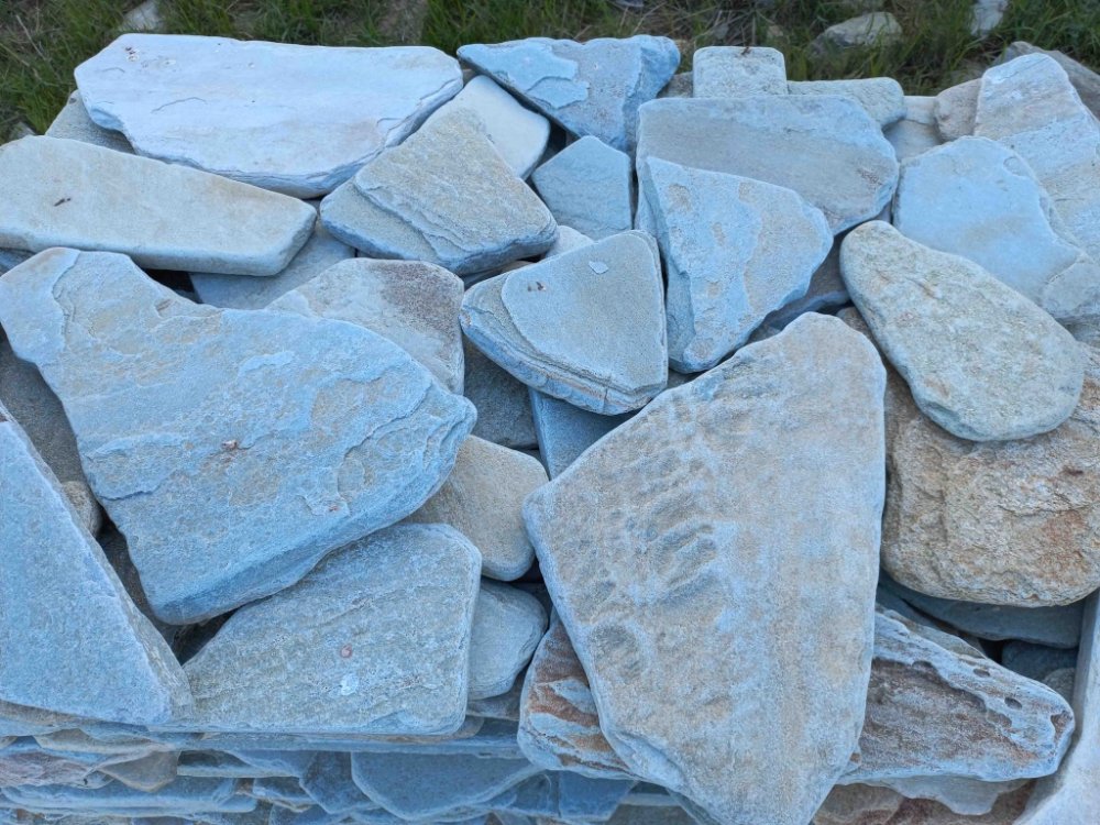 - плитняк пилёный на плитки- камень природной формы подвергается распиливанию диском с алмазным напылением в камнерезном цехе. Облицовка плиткой применяется, когда нужны чёткие формы на объекте, и природная форма не годится. Толщина плитки, используемой для облицовки составляет для разных видов камней от 1 см. до 4 см. Распиленный камень изготавливается нескольких видов, в зависимости от количества распилов: