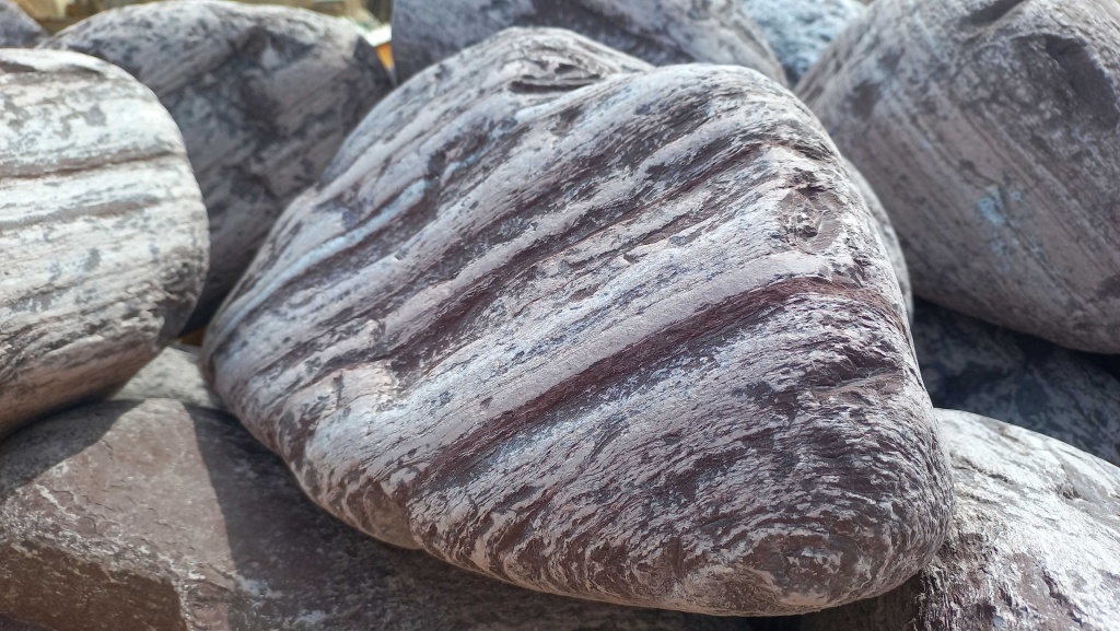 Лемезит галтованные ландшафтные валуны размером не более футбольного мяча. Цвет бордово-белый.