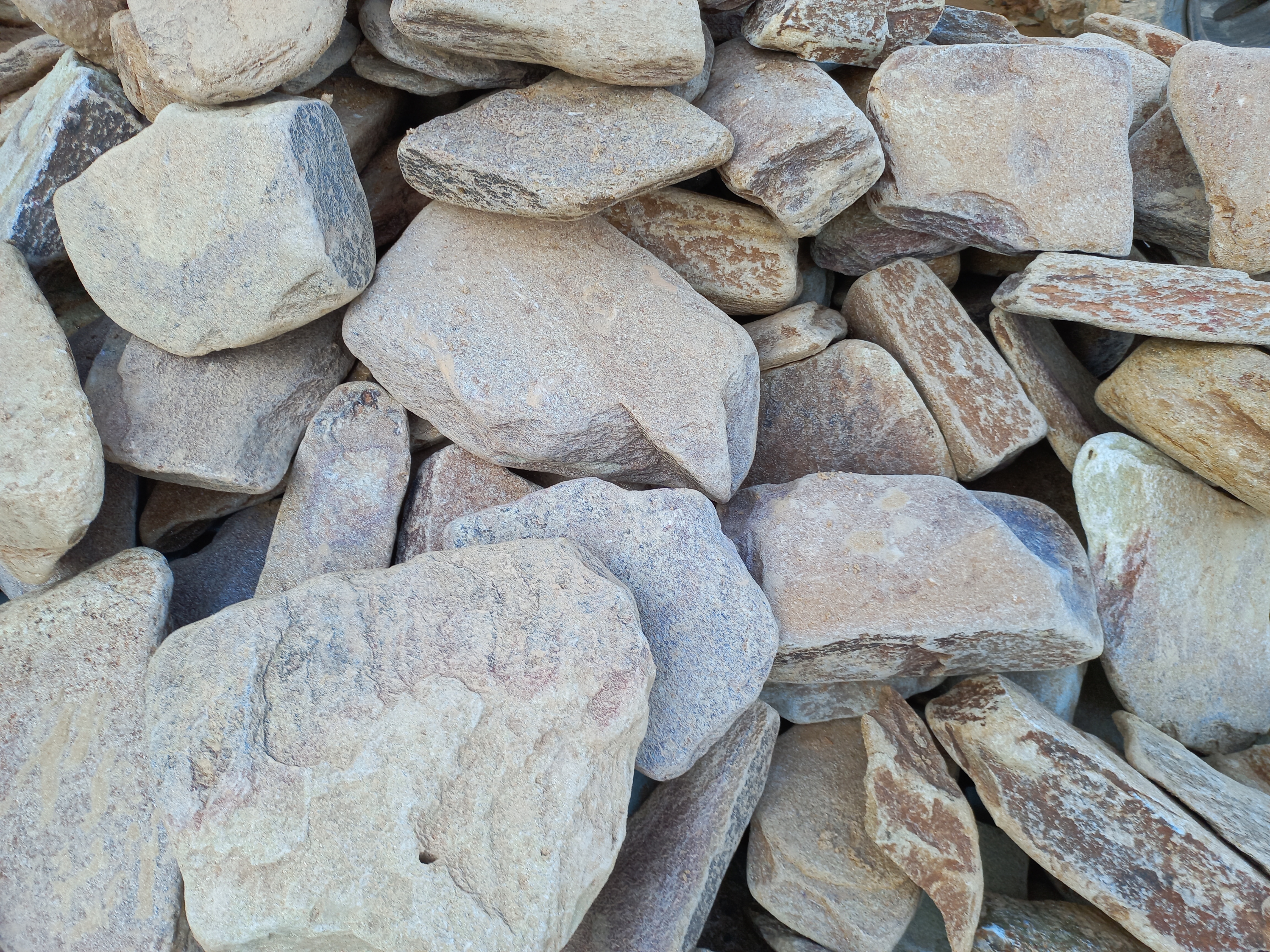 - плитняк дикий галтованный(окатанный, скруглённый) – камень природной форме, прошедший процесс галтовки в барабане. В процессе галтовки в барабан загружается камень природной формы, плитки камня бьются друг об друга, стачивая и сбивая неровные, острые края. После завершения технологической операции камень приобретает округлую форму краёв, становится похож на состаренный камень – как будто он сотни лет пролежал под воздействием ветра и дождей. Галтованный камень при облицовке придаёт объекту вид старины, таинственности. Если галтованным камнем выкладывают дорожки или площадки, создаётся впечатление, что мощению, выполненному этим камнем - сотни лет.