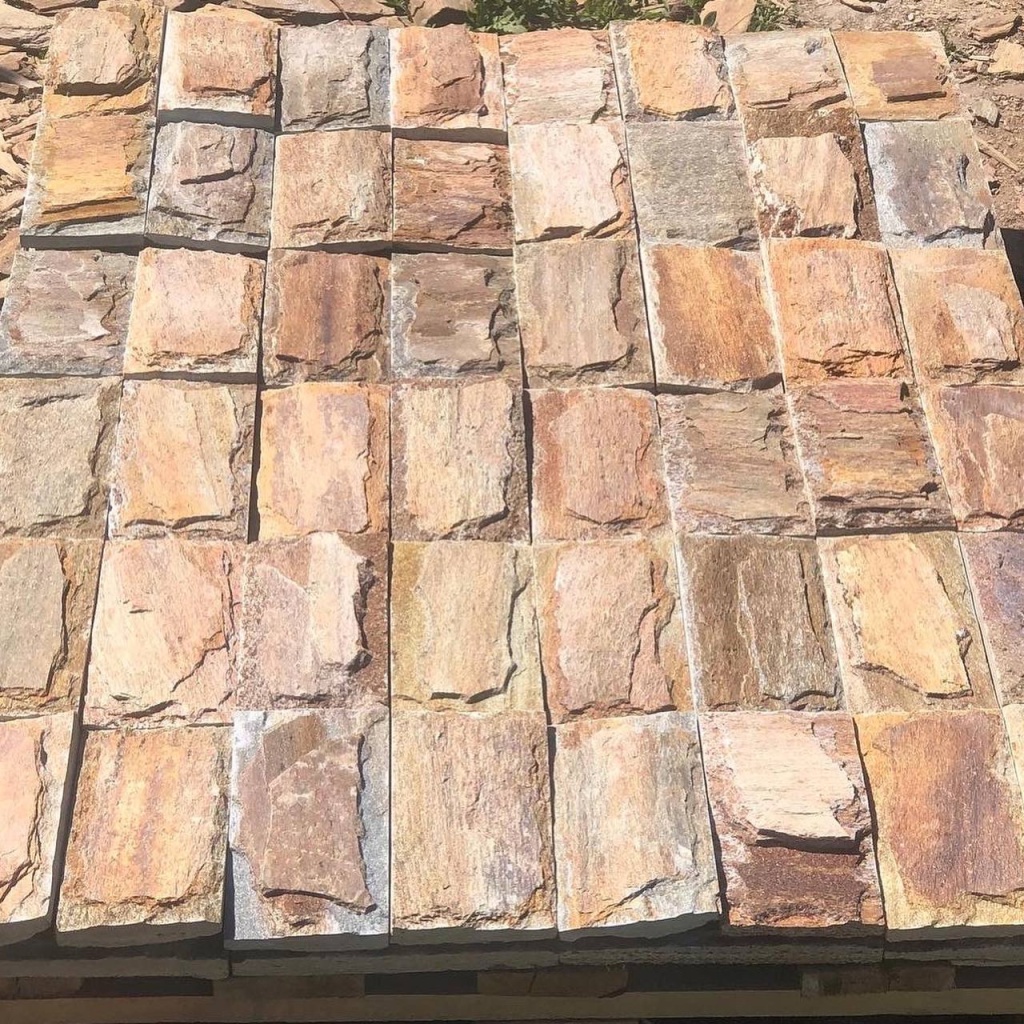 - плитняк пилёный на плитки- камень природной формы подвергается распиливанию диском с алмазным напылением в камнерезном цехе. Облицовка плиткой применяется, когда нужны чёткие формы на объекте, и природная форма не годится. Толщина плитки, используемой для облицовки составляет для разных видов камней от 1 см. до 4 см. Распиленный камень изготавливается нескольких видов, в зависимости от количества распилов: