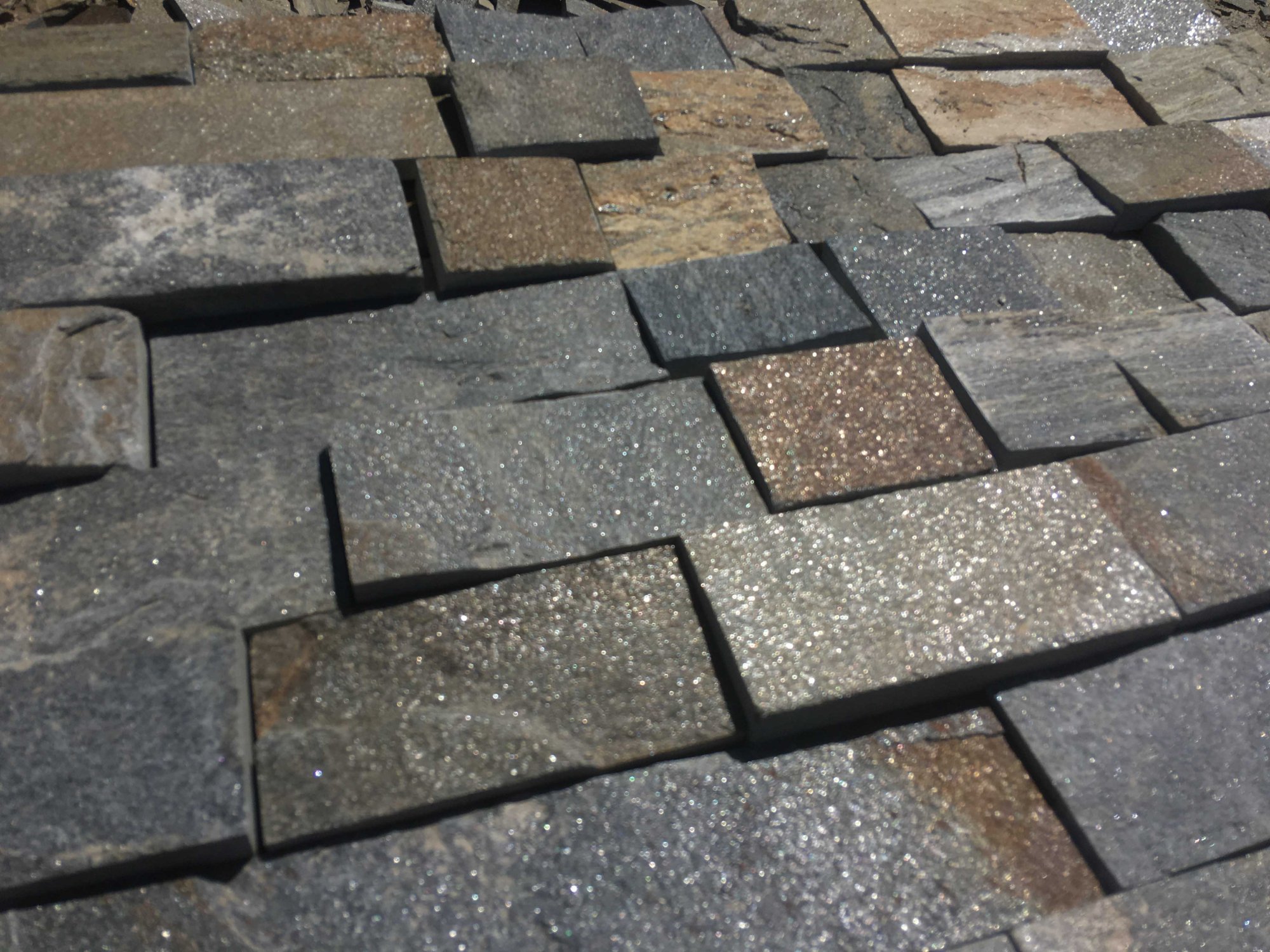 - плитняк пилёный на плитки- камень природной формы подвергается распиливанию диском с алмазным напылением в камнерезном цехе. Облицовка плиткой применяется, когда нужны чёткие формы на объекте, и природная форма не годится. Толщина плитки, используемой для облицовки составляет для разных видов камней от 1 см. до 4 см. Распиленный камень изготавливается нескольких видов, в зависимости от количества распилов: