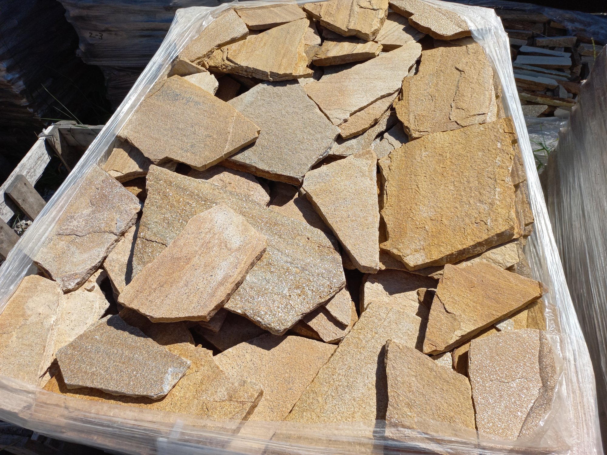 - необработанные плитки толщиной - 1,5-3 см. - по 30м2 на 1 поддоне - применяется в для облицовки вертикальных поверхностей, плитки от 2 до 3 см., благодаря цельной структуре и прочности камня, также можно применять для мощения дорожек, но только на бетонное основание.