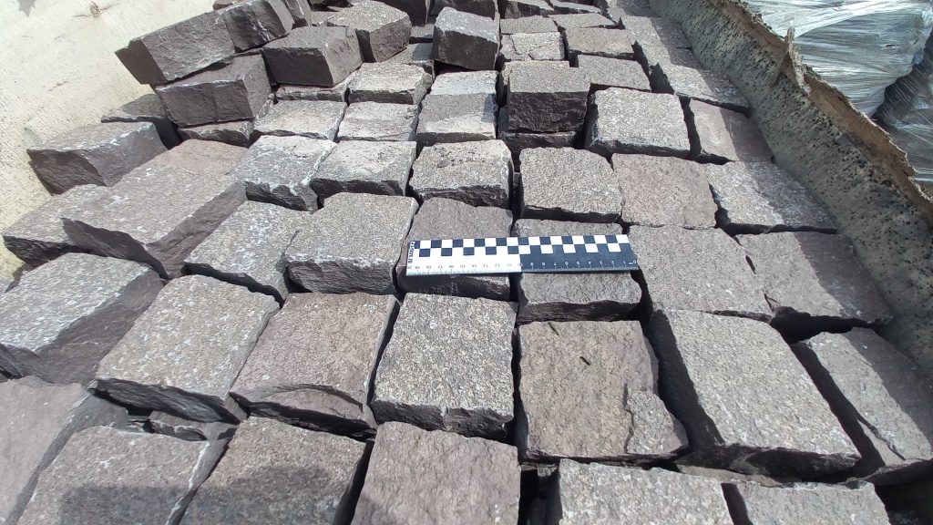 Брусчатка производится путём раскола каменных плит на камнекольном станке, имеет неровные края, прямоугольную форму. Размер 10 см * 10 см.
