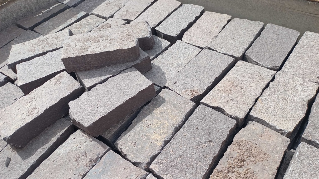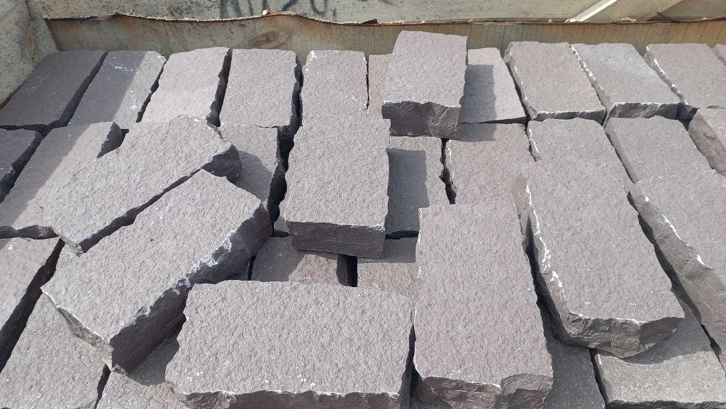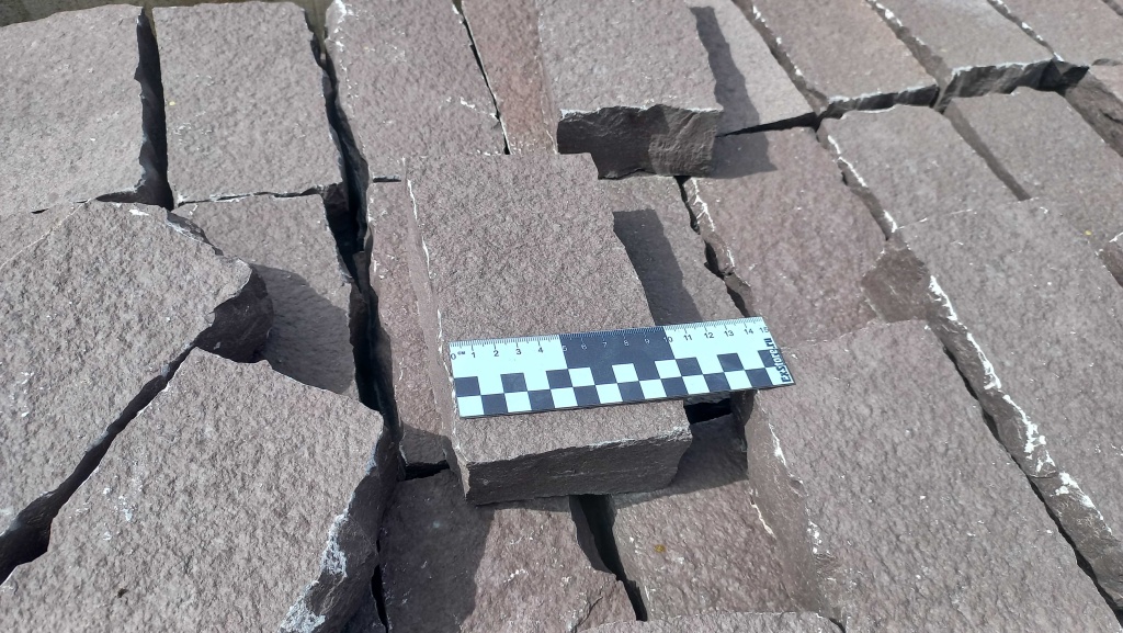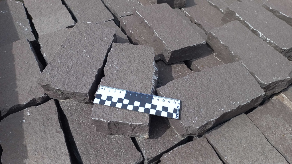 Брусчатка производится путём раскола каменных плит на камнекольном станке, имеет неровные края, прямоугольную форму. Размер 10 см * 20 см.