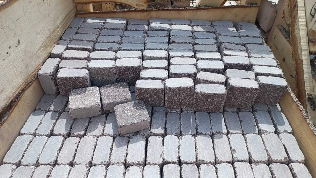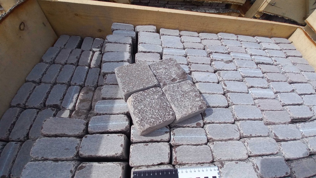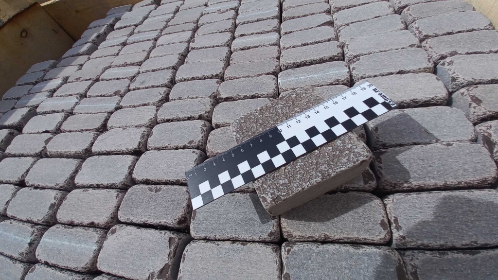 Брусчатка производится путём раскола каменных плит на камнекольном станке, имеет ровные отпиленные края, обработку галтовкой прямоугольную форму. Размер 10 см * 10 см.