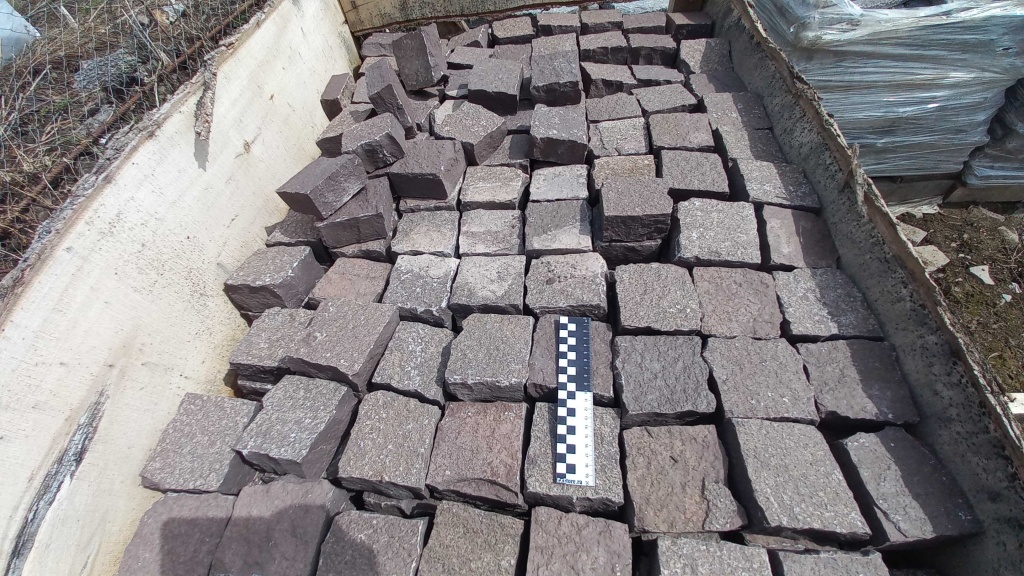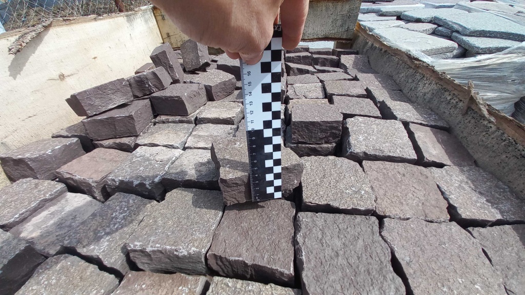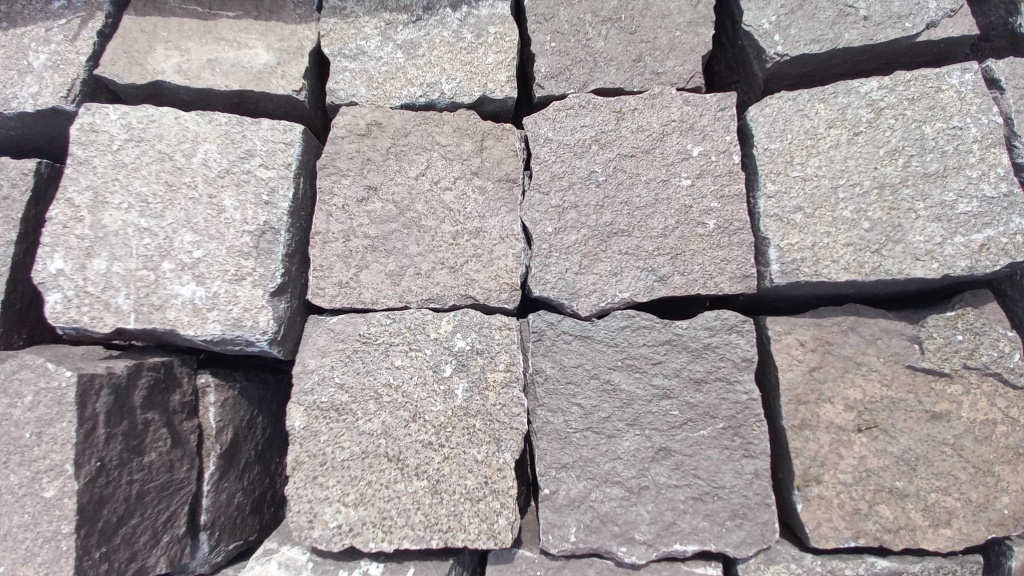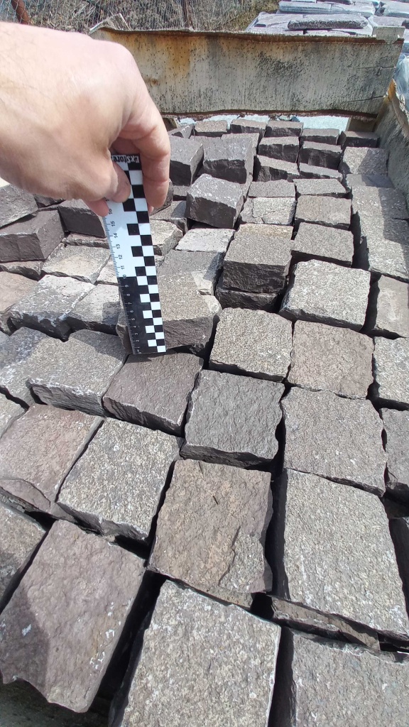 Брусчатка производится путём раскола каменных плит на камнекольном станке, имеет неровные края, прямоугольную форму. Размер 10 см * 10 см.