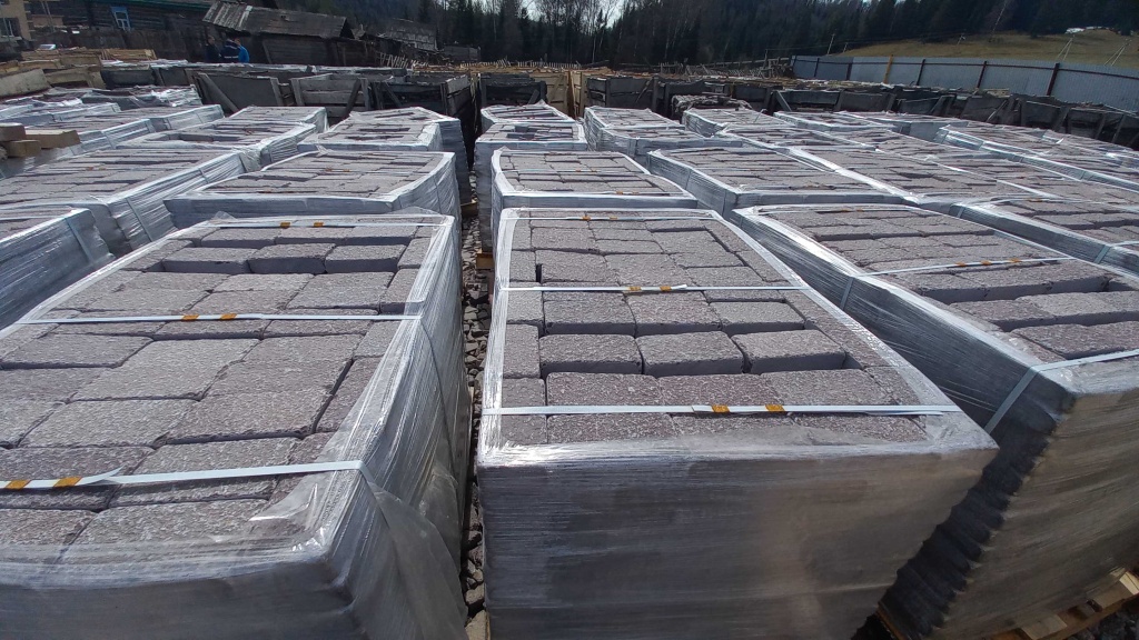 Брусчатка производится путём раскола каменных плит на камнекольном станке, имеет ровные отпиленные края, обработку галтовкой прямоугольную форму. Размер 10 см * 20 см.